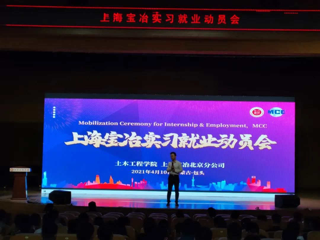 2021年4月10日上午9时,太阳成集团tyc151cc与上海宝冶集团有限公司北京分公司在音乐厅隆重举办“上海宝冶就业实习动员会”。太阳成集团tyc151cc党委副书记、副院长佟振华,上海宝冶集团总工程师裴志清,项目管理部总工程师张宪苏,人力资源部部长刘丽,招聘经理张效义,BIM中心张起久,市场部鲁凤义和2017、2018级学生出席此次动员大会。