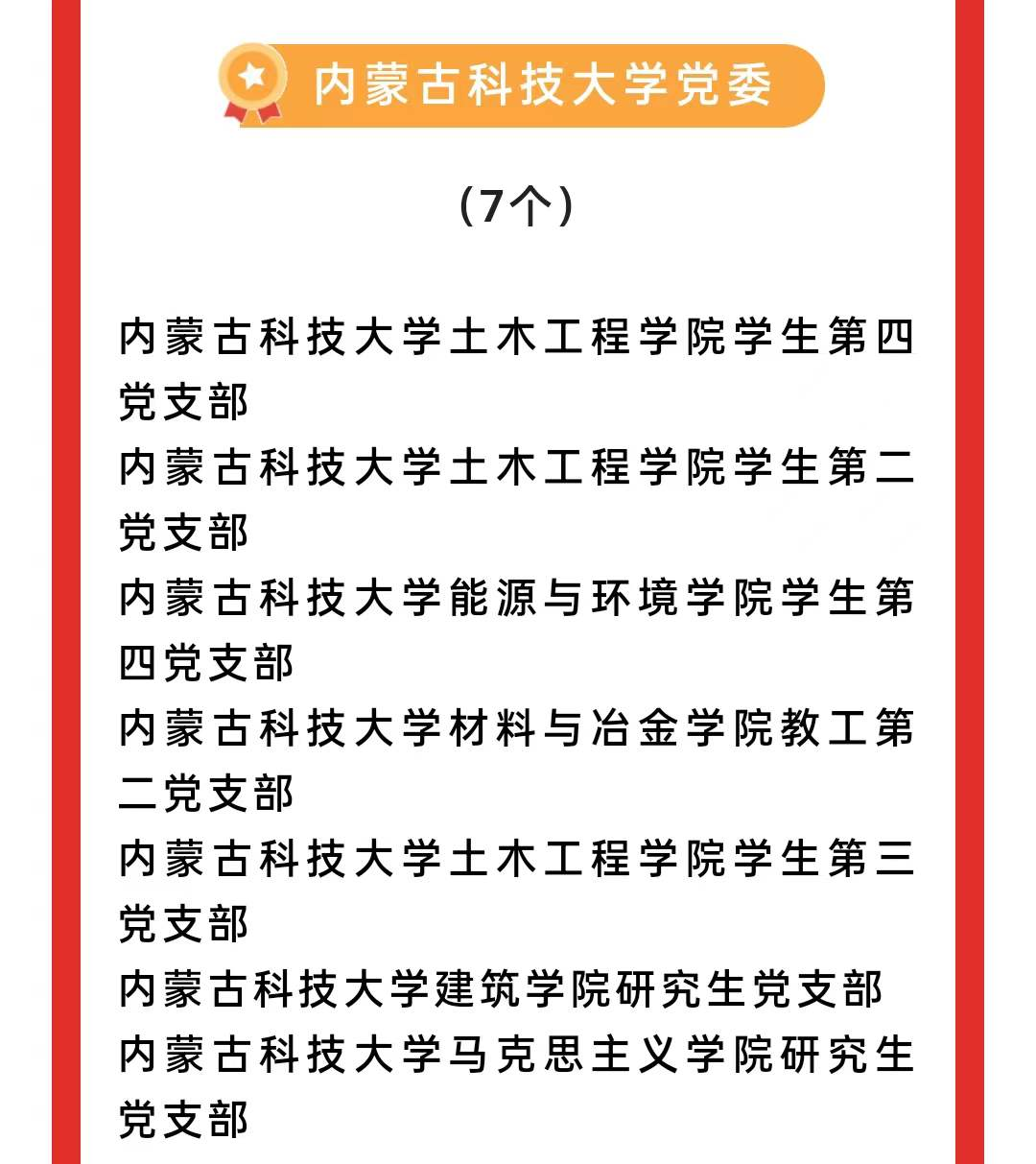 2020年以来,按照自治区党委组织部、包头市委组织部统一部署,学院党委对照“五强标准”,在8个党支部全面开展“最强党支部”建设,全面提升党组织标准化规范化建设水平,增强党组织的政治功能和组织力,首批打造了土木系教工党支部1个包头市“最强党支部”;2022年,7个党支部被命名为太阳集团“最强党支部”,3个党支部被命名为包头市“最强党支部”,实现了最强党支部全覆盖,为学院各项事业发展提供强有力的组织保障。