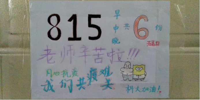 “我们怀着拆盲盒的期待去拆午餐 ”、“我们被科大照顾的很好”、 “老师志愿者们辛苦了”、.....学生们在朋友圈表达着感谢,也会把饭菜拍给家长看,说“我们被照顾得挺好的,放心吧。”无法与关爱和帮助他们的老师、志愿者面对面,学生们在宿舍的点餐门牌上,写满了感谢的话语。