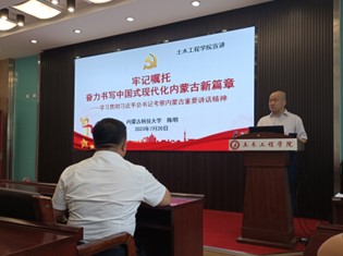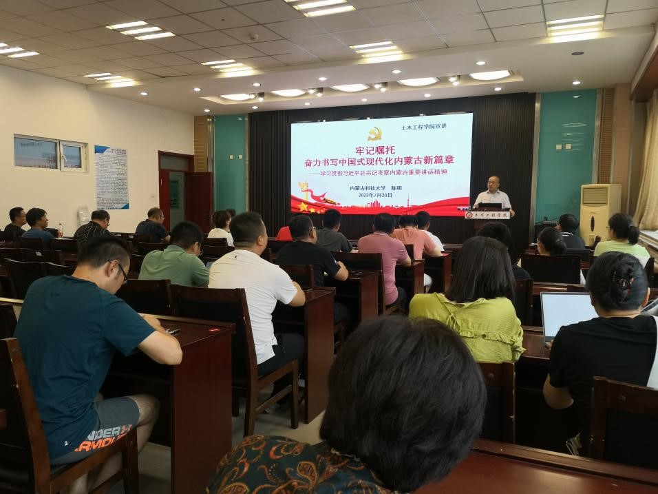 为全面深入学习贯彻习近平总书记考察内蒙古重要讲话精神,扎实推进学习宣传贯彻工作,2023年7月20日16:30,校党委委员、副校长陈明于逸夫楼B404开展了以牢记嘱托奋力书写中国式现代化内蒙古新篇章——学习贯彻习近平总书记考察内蒙古重要讲话精神为主题的宣讲活动,太阳成集团tyc151cc全体教职工参加活动。