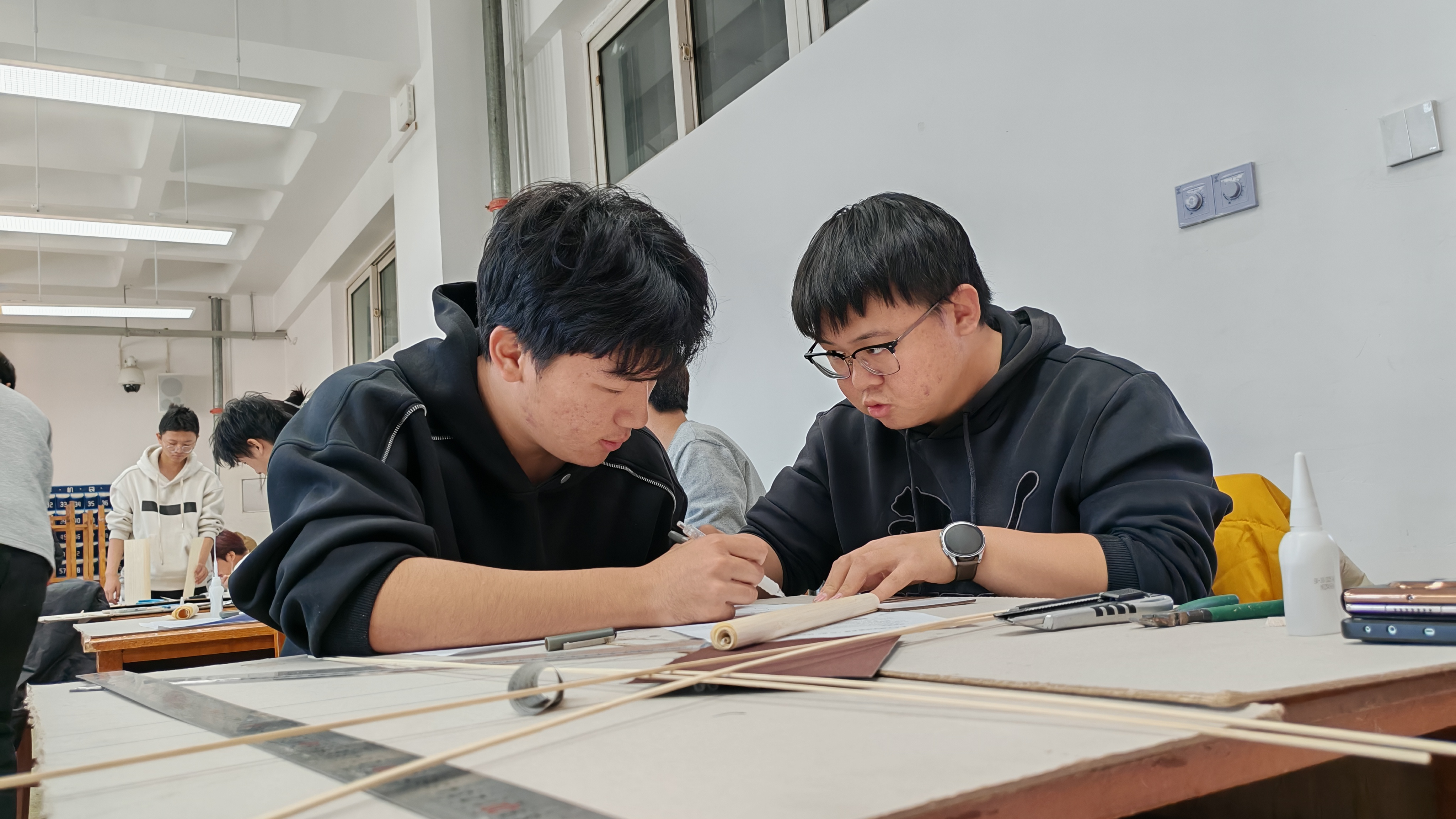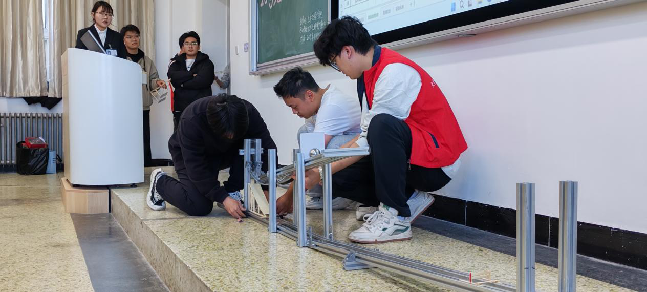 本次比赛采用现场发布赛题的形式,选手们需在规定的4个小时内完成审题、构思到制作模型这一全过程。比赛要求参赛小组在规定的矩形内部做一个轨道模型,使508g的小球在重力作用下沿着轨道滚动到底端并撞击横栏后滚向对向轨道,以检验小球最终滚动距离为主要评分指标。在模型制作现场,参赛选手们收到赛题后先审题,根据赛题要求,在四个小时之内合理的受力分析和判断并制作,一条条“轨道”逐渐成形。