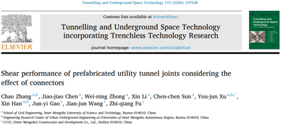 近日,我院隧道智慧建养与深地储能技术团队张朝副教授在Tunnelling and Underground Space Technology期刊(JCR一区,中科院一区TOPIF=7.4)发表题为“Shear performance of prefabricated utility tunnel joints considering the effect of connectors”(DOI: https://doi.org/10.1016/j.tust.2026.107538)的研究成果。
