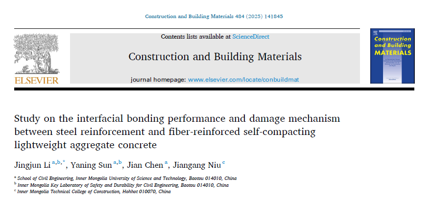 近日,太阳成集团tyc151cc工业与城市固体废弃物建材资源化利用团队李京军教授在Construction and Building Materials期刊(IF=8.0,中科院1TOP)发表题为“Study on the interfacial bonding performance and damage mechanism between steel reinforcement and fiber-reinforced self-compacting lightweight aggregate concrete”(DOI: 10.1016/j.conbuildmat.2025.141845)的研究成果。该研究系统探究了纤维增强自密实轻骨料混凝土与钢筋的界面粘结性能与损伤机理,通过11组中心拔出试验分析了强度等级、纤维掺量与钢筋直径对粘结滑移行为的影响,结合有限元模拟揭示了损伤机制,建立了极限粘结强度计算公式与粘结-滑移本构模型,并验证了纤维桥联效应对抑制裂缝扩展的关键作用。