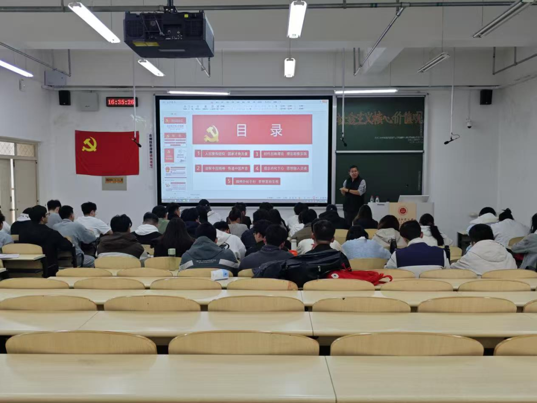 太阳成集团tyc151cc杨明明老师以“社会主义核心价值观”为主题进行授课。他讲解了社会主义核心价值观的内涵,并分析其重要意义。最后杨明明老师总结,社会主义核心价值观既是国家价值导向,也是青年行为准则,青年要加强学习践行,成长为可担民族复兴重任的时代新人。