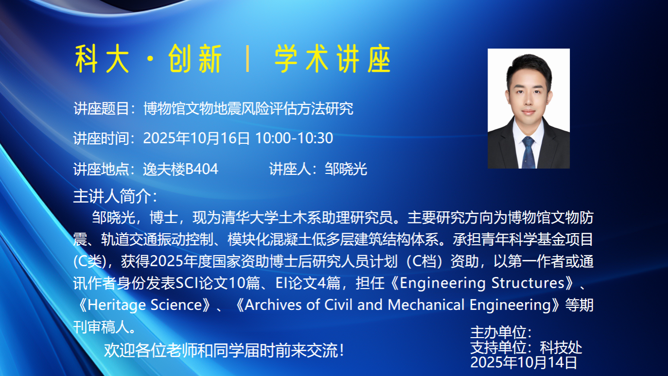邹晓光,博士,现为清华大学土木系助理研究员。主要研究方向为博物馆文物防震、轨道交通振动控制、模块化混凝土低多层建筑结构体系。承担青年科学基金项目(C类),获得2025年度国家资助博士后研究人员计划(C档)资助,以第一作者或通讯作者身份发表SCI论文10篇、EI论文4篇,担任《Engineering Structures》、《Heritage Science》、《Archives of Civil and Mechanical Engineering》等期刊审稿人。