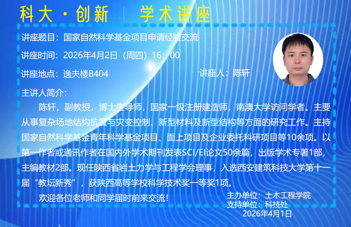 陈轩,副教授,博士生导师,国家一级注册建造师,南澳大学访问学者。主要从事复杂场地结构抗震与灾变控制、新型材料及新型结构等方面的研究工作。主持国家自然科学基金青年科学基金项目、面上项目及企业委托科研项目等10余项。以第一作者或通讯作者在国内外学术期刊发表SCI/EI论文50余篇,出版学术专著1部,主编教材2部。现任陕西省岩土力学与工程学会理事,入选西安建筑科技大学第十一届“教坛新秀”,获陕西高等学校科学技术奖一等奖1项。