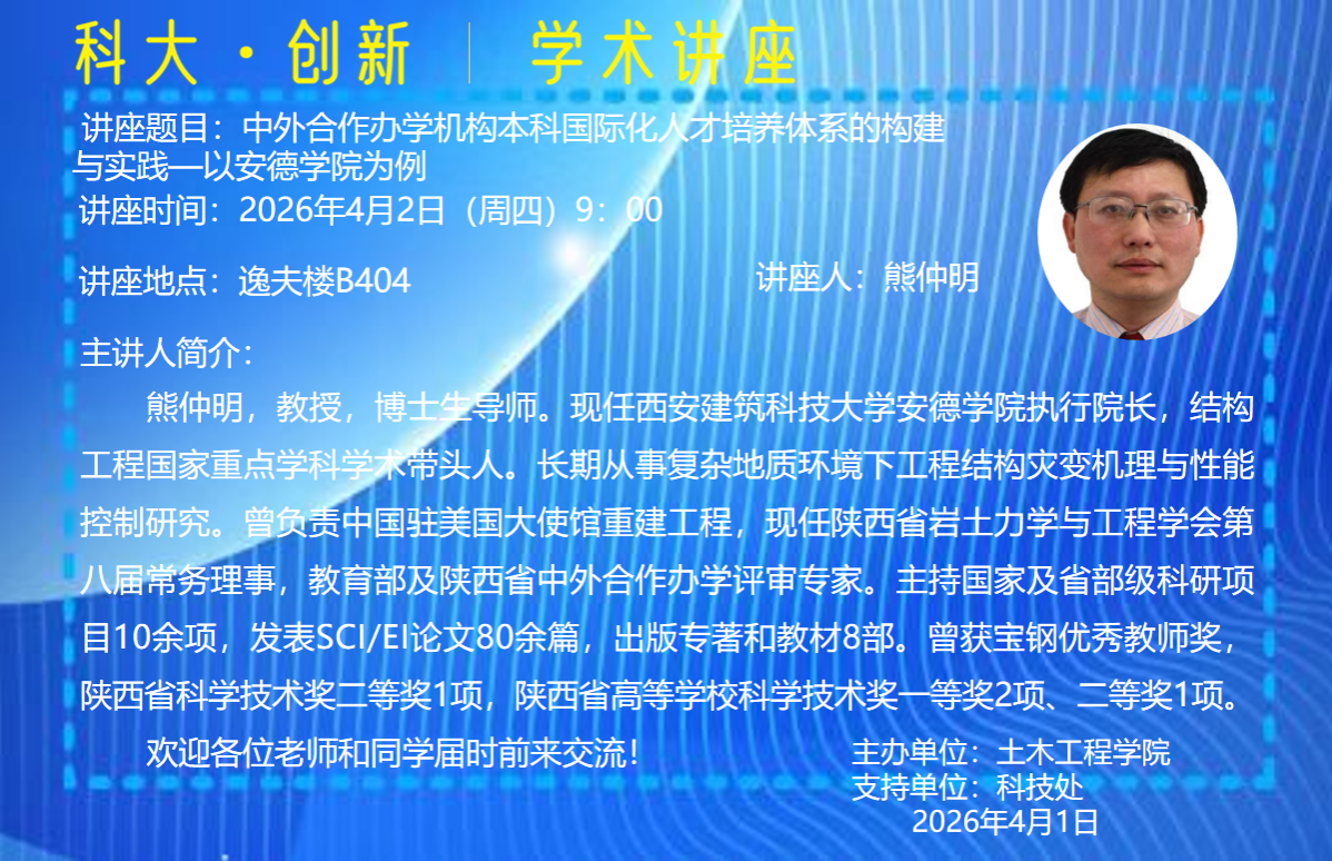 熊仲明,教授,博士生导师。现任西安建筑科技大学安德学院执行院长,结构工程国家重点学科学术带头人。长期从事复杂地质环境下工程结构灾变机理与性能控制研究。曾负责中国驻美国大使馆重建工程,现任陕西省岩土力学与工程学会第八届常务理事,教育部及陕西省中外合作办学评审专家。主持国家及省部级科研项目10余项,发表SCI/EI论文80余篇,出版专著和教材8部。曾获宝钢优秀教师奖,陕西省科学技术奖二等奖1项,陕西省高等学校科学技术奖一等奖2项、二等奖1项。