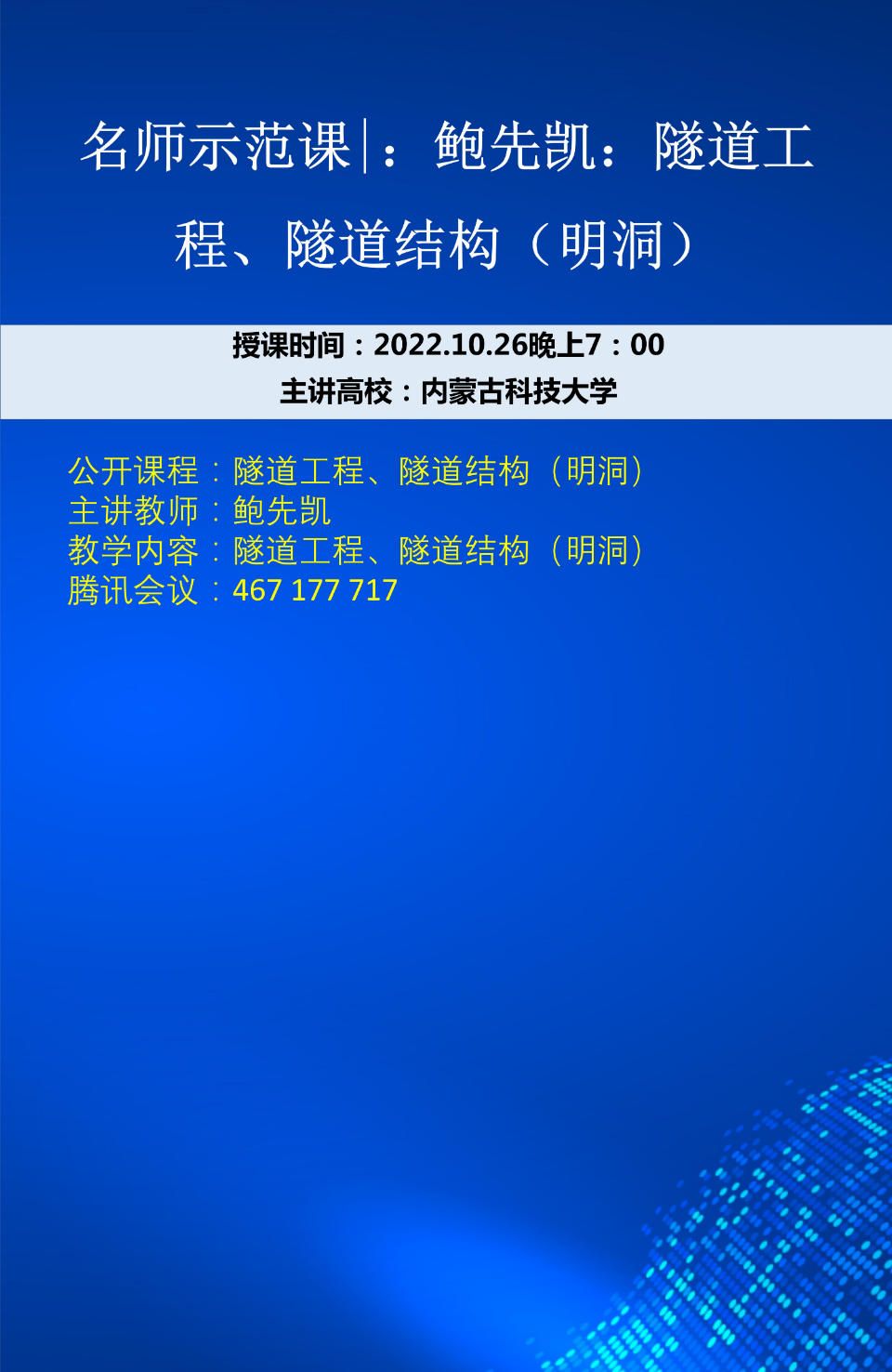 2022年10月26日晚,土木工程专业虚拟教研室名师示范课系列活动成功举办隧道工程专题课程。太阳集团鲍先凯老师以"隧道工程、隧道结构(明洞)"为主题,通过腾讯会议平台为全国土木工程专业师生带来了一场内容扎实、重点突出的专业课程教学展示。