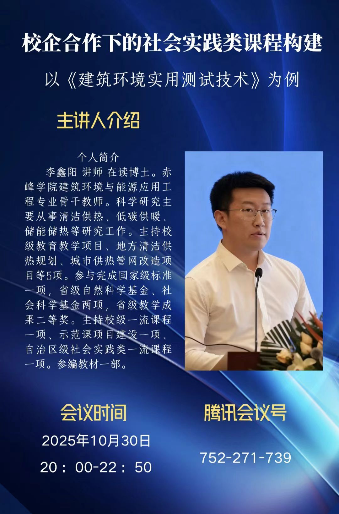 2025年10月30日晚,土木工程专业虚拟教研室系列教研活动迎来一场聚焦“校企合作与社会实践课程建设”的专题分享。赤峰学院李鑫阳讲师以“校企合作下的社会实践类课程构建——以《建筑环境实用测试技术》为例”为主题,通过腾讯会议平台进行了深度分享,为参会师生呈现了一场理论与实践深度融合的教学研讨。