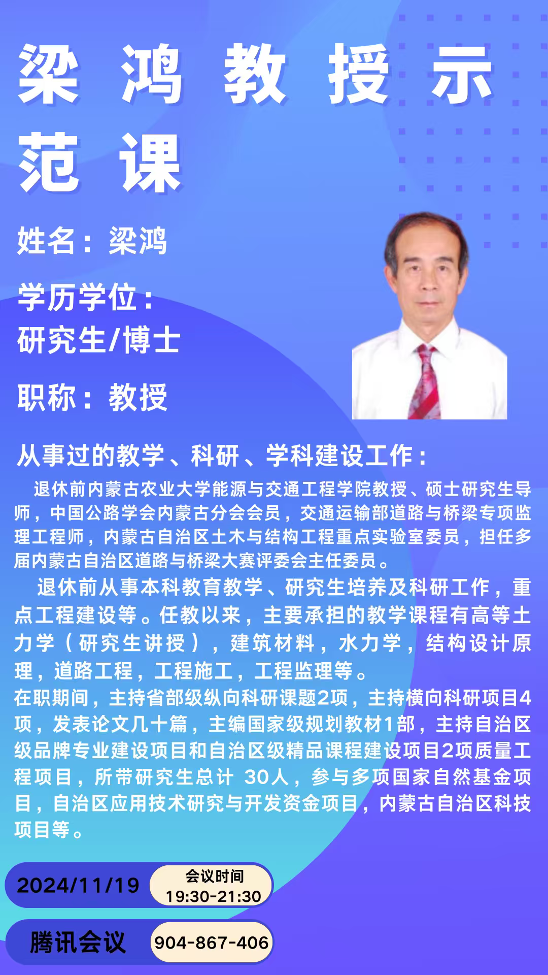 11月19日晚,一场聚焦道路工程与交通建设的高水平示范课在云端开讲。本次课程由内蒙古农业大学能源与交通工程学院退休教授、硕士研究生导师梁鸿主讲,通过腾讯会议平台,为与会师生与行业同仁带来了一场理论与实践深度融合的学术盛宴。